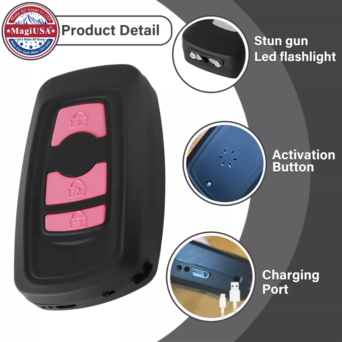 The MagiUSA 1801 Keychain Stun Gun for Self Defense is a compact, keychain-style personal safety device designed for everyday carry and quick access. Shaped to fit naturally with car keys or small bags, this model emphasizes convenience, portability, and discreet personal protection.